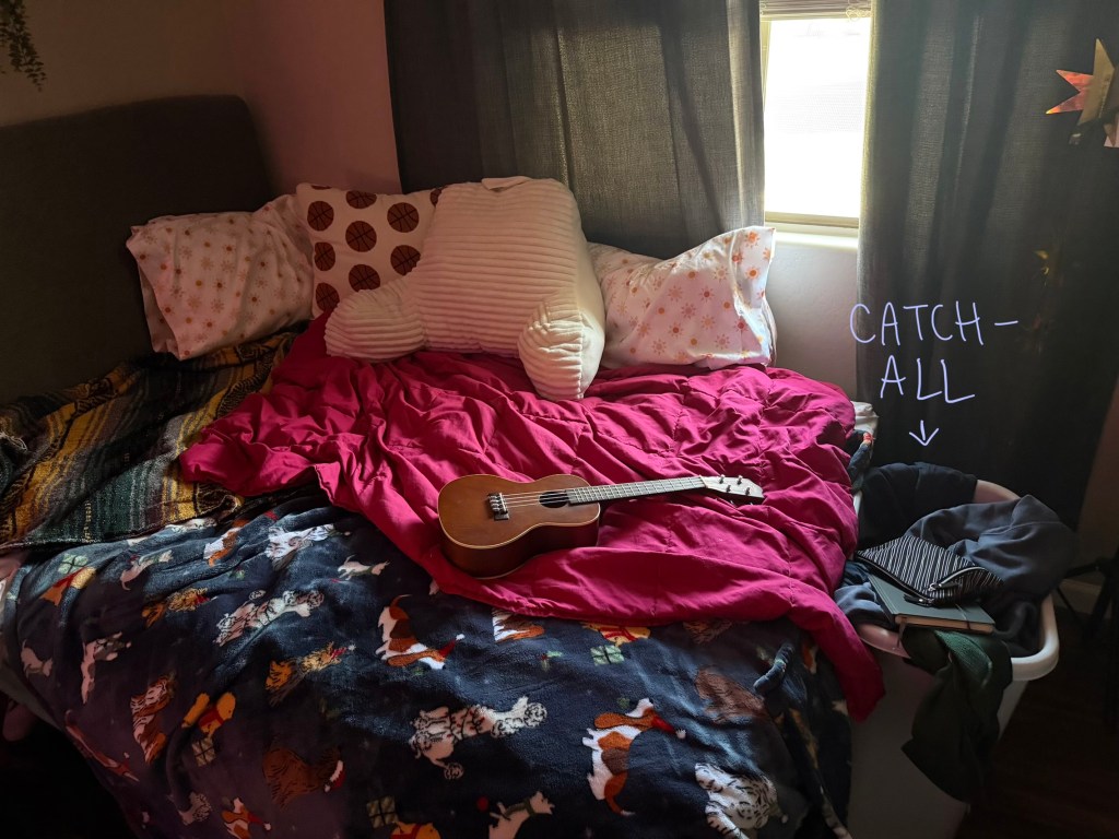 When I began analyzing my room from a professional cleaning perspective (I recently became a professional cleaner), the implementation a multiple catch-all systems was a no-brainer. I placed a designated catch-all laundry basket next to my bed for the hoodies, not-yet-dirty shirts, small blankets, sketchbooks, and headphones that were clogging up my space. The vision entailed my bed being cleared every single night; no matter what. Needless to say, this very low-effort clearing method was extremely successful.