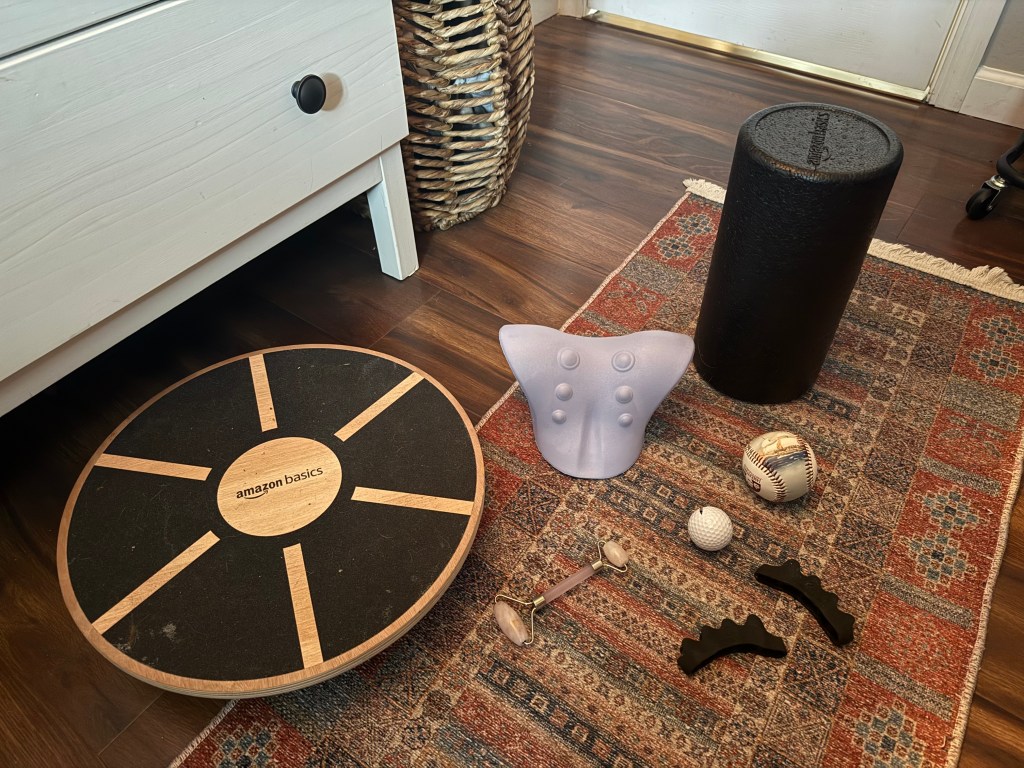 Legs up in the air while you’re laying down is a classic lymphatic drainage pose. You can double-dip and do this while you rest on a neck corrector. I do this and then swing my knees in a circular motion whilst still laying down to release tension around my tail bone (this feels crazy good, I swear). I’ll lean into this and massage my upper glutes using my weight against the floor. I use my balance board for hip and hamstring restructuring.